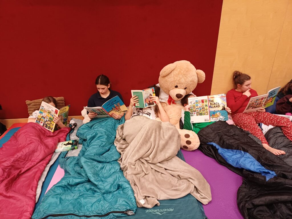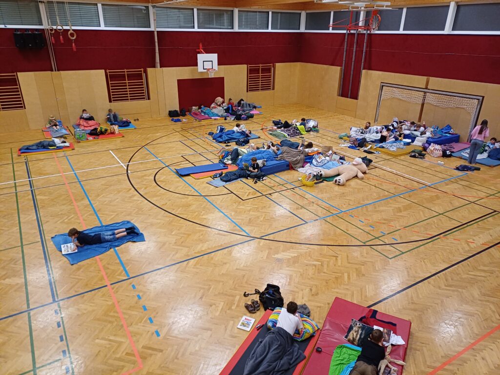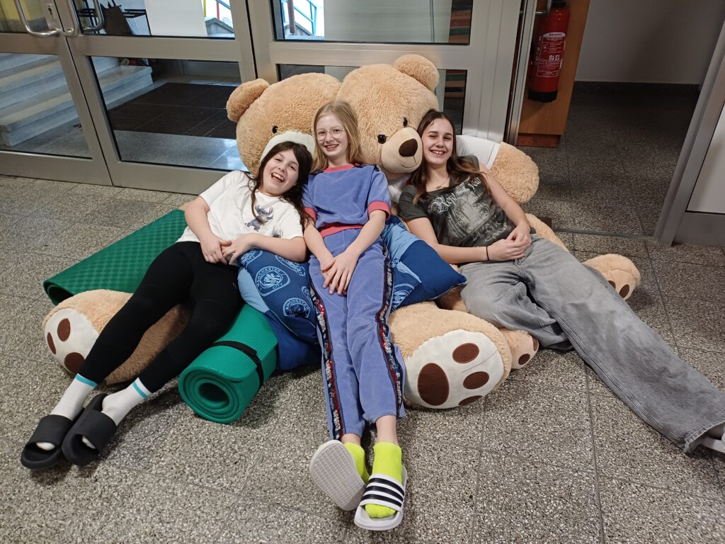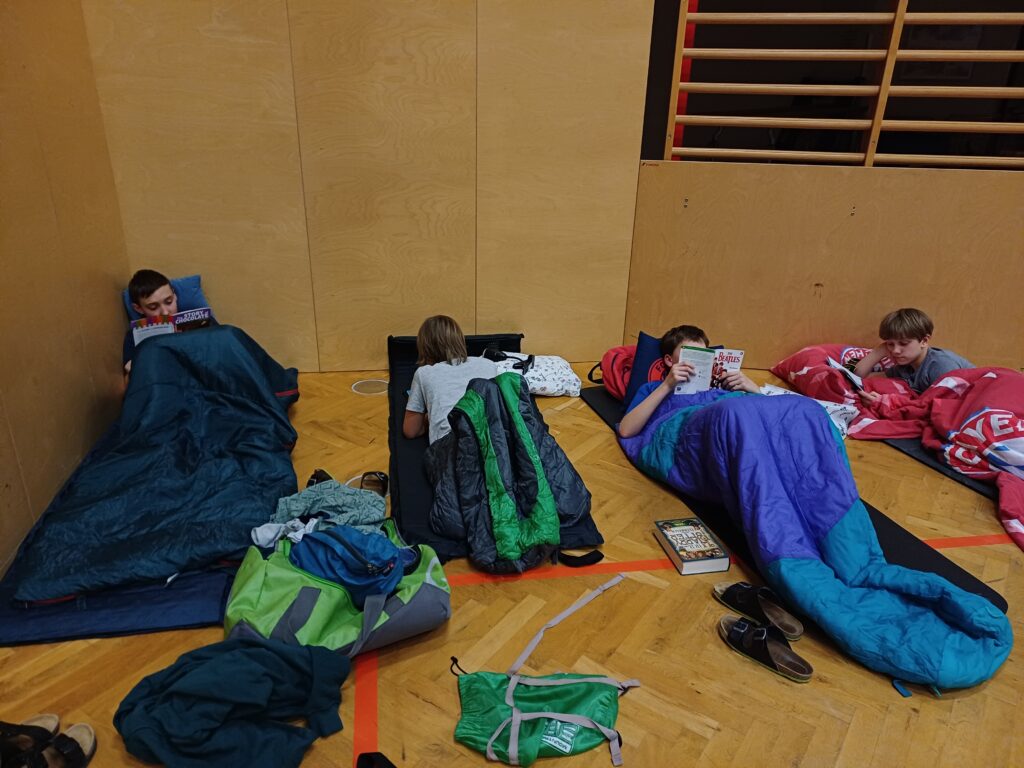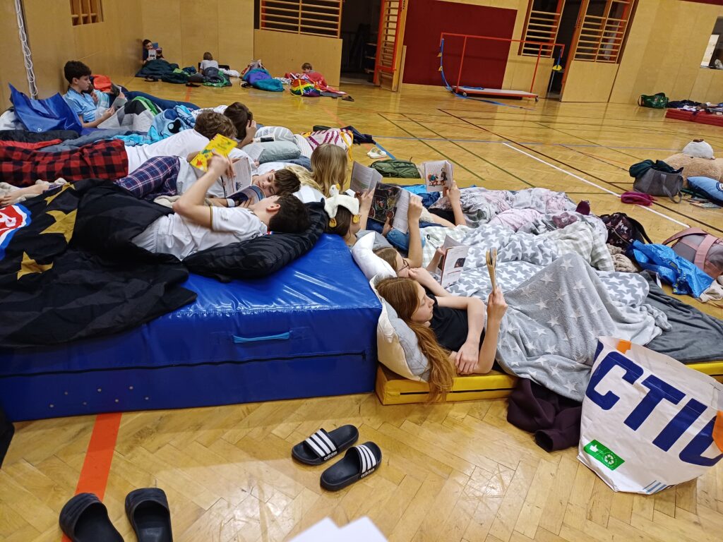 Die Kinder der 2. Klassen erlebten am Mittwoch vor den Osterferien eine lange Nacht in der Schule. Nach der Ankunft am Abend fanden abwechslungsreiche Aktivitäten in Kleingruppen statt, in denen gesungen, gebacken, gelesen, gerätselt und Dodgeball gespielt wurde. Danach wurde das Nachtlager im Turnsaal vorbereitet, auf dem sich die Kinder gemütlich in die englische Leselektüre vertiefen konnten. Vor dem Schlafengehen kam noch „Paddington“ auf die Leinwand des Turnsaals.